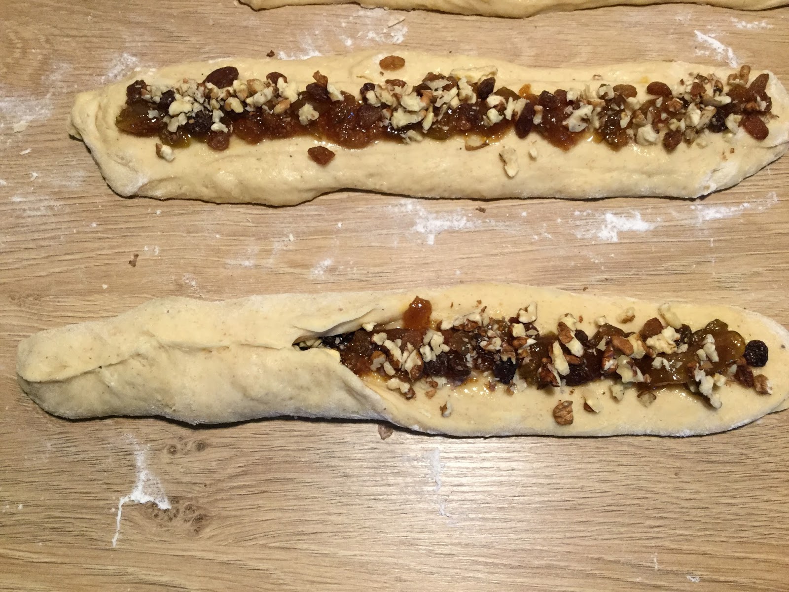 Намажете с разтопено масло и подредете плънката - сладко от смокини (едро нарязани), стафиди, предварително накиснати в ароматен коняк Хенеси и орехови ядки.